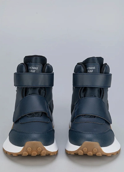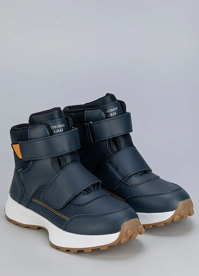 • Зимние ботинки для мальчиков Thomas Graf с высоким берцем и липучками в насыщенно-синем цвете с контрастной жёлтой строчкой. Модель выполнена из влагостойких материалов, дополнена прочной нескользящей подошвой. Анатомическая форма и мягкий внутренний слой создают комфорт даже при длительном ношении.