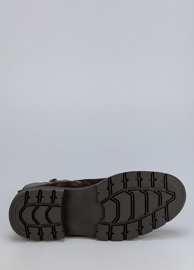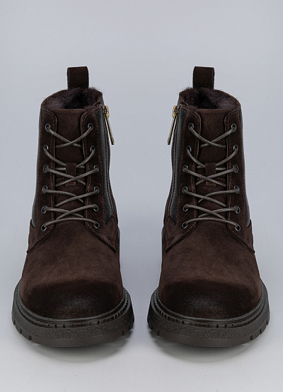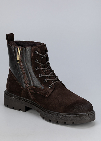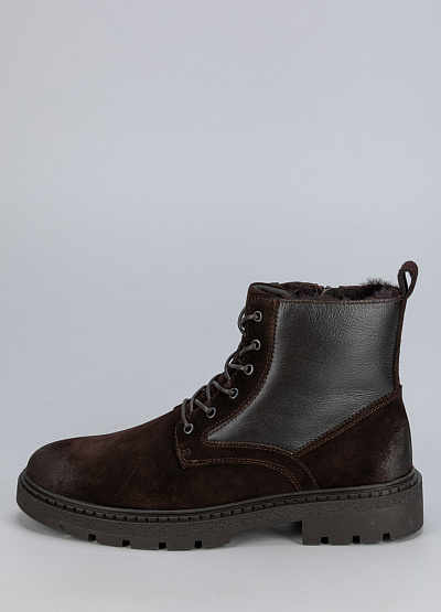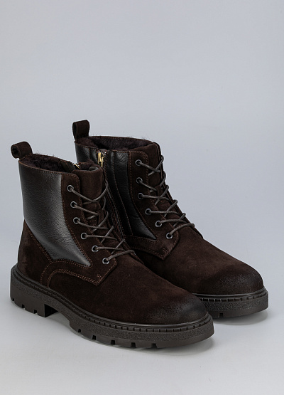 Мужские зимние ботинки Duca Daretti выполнены в комбинированном дизайне из плотной тёмно-коричневой замши. Высокая шнуровка обеспечивает надёжную фиксацию стопы, а внутренняя утеплённая отделка создаёт максимальный комфорт в холодную погоду. Массивная протекторная подошва гарантирует устойчивость и уверенное сцепление с поверхностью, делая модель отличным выбором для зимнего сезона.