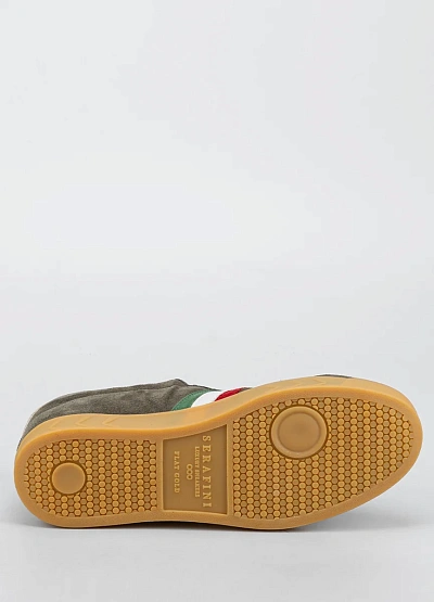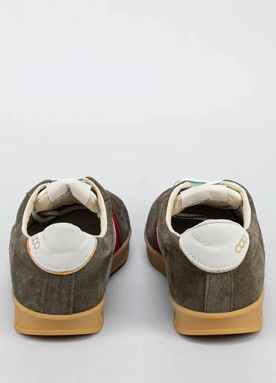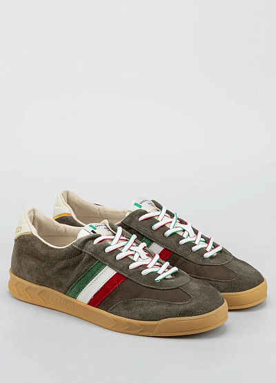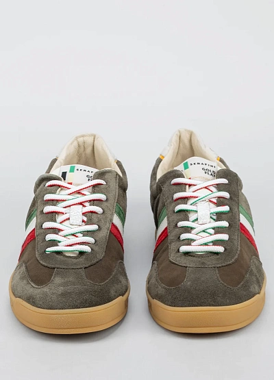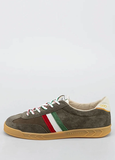 Мужские кеды в повседневном стиле, выполненные в серо-коричневой гамме с акцентными деталями. Модель украшена контрастными полосами красного, белого и зелёного цветов сбоку, а также комбинированной отделкой пятки и разноцветными шнурками. Классический силуэт дополняет светлая подошва.