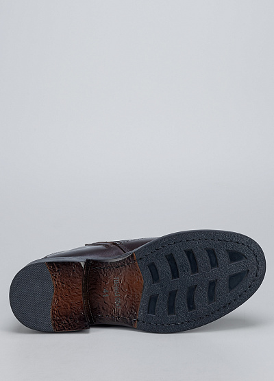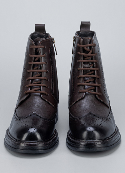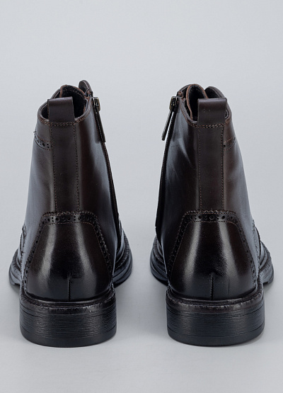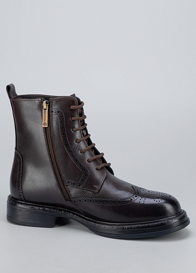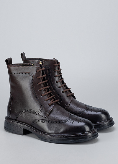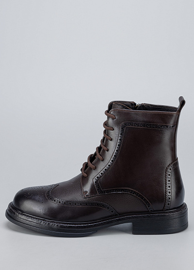 Мужские демисезонные ботинки в классическом стиле броги, выполненные из натуральной кожи тёмно-коричневого цвета. Модель отличается элегантным силуэтом, декоративной перфорацией и аккуратной шнуровкой, которая обеспечивает надёжную посадку по стопе. Прочная подошва с небольшим каблуком делает ботинки устойчивыми и удобными для повседневной носки, сохраняя при этом строгий и презентабельный внешний вид.