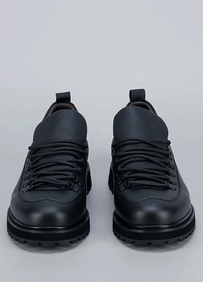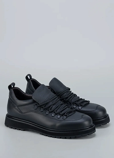 Мужские ботинки Duca Daretti — современное воплощение практичного городского стиля с намёком на альпийскую классику. Модель выполнена из плотной натуральной кожи в насыщенном чёрном цвете. Декоративная шнуровка с металлическими петлями и утолщённый язык создают динамичный силуэт и надёжную фиксацию стопы. Подошва с глубоким протектором обеспечивает отличное сцепление с поверхностью и комфорт при ходьбе.