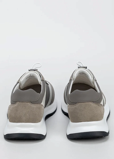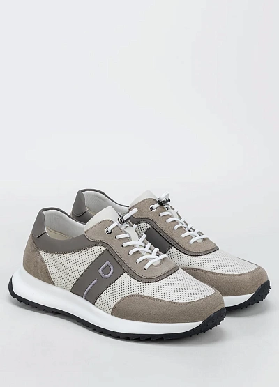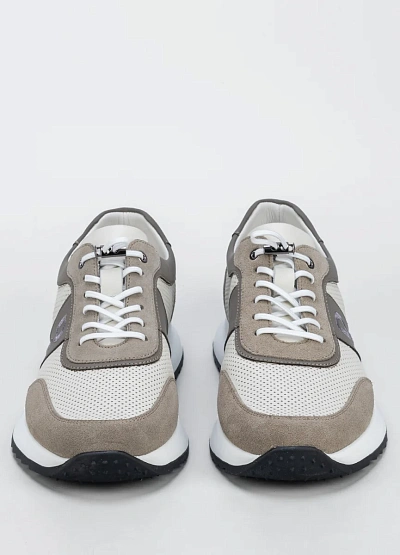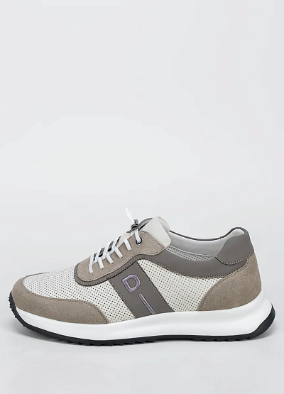 Мужские кроссовки в светлой цветовой гамме, сочетающей бежевые, серые и белые оттенки. Модель отличается перфорированными вставками и контрастными деталями, а также шнуровкой и низким силуэтом.