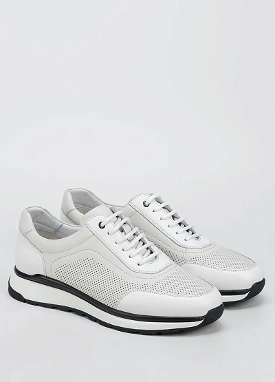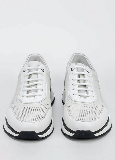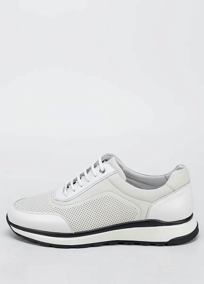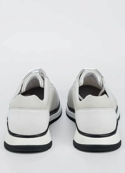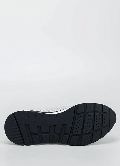 Мужские кроссовки выполнены в светлой цветовой гамме с сочетанием белого и светло-серого. Модель отличается наличием перфорации на боковых и передних частях, а также классической шнуровкой. Подошва контрастного цвета добавляет внешнему виду динамики.