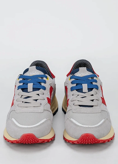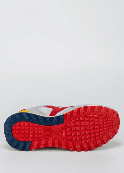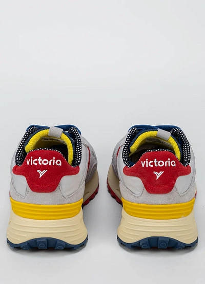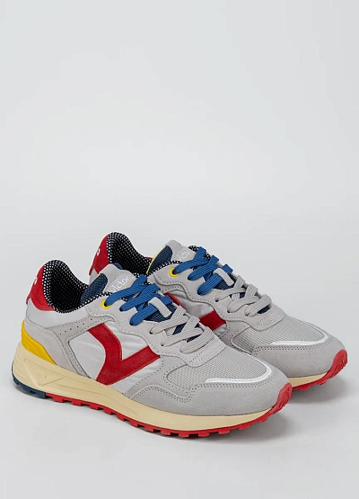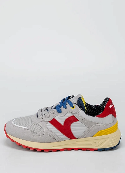 Мужсие кроссовки в светлой цветовой гамме с элементами синего, красного и жёлтого цветов. Модель с акцентной цветной подошвой и контрастными деталями, выполненная в спортивном стиле.