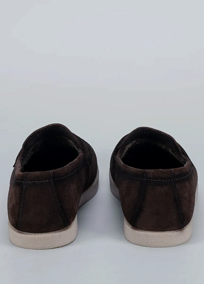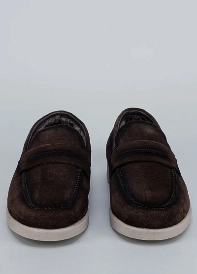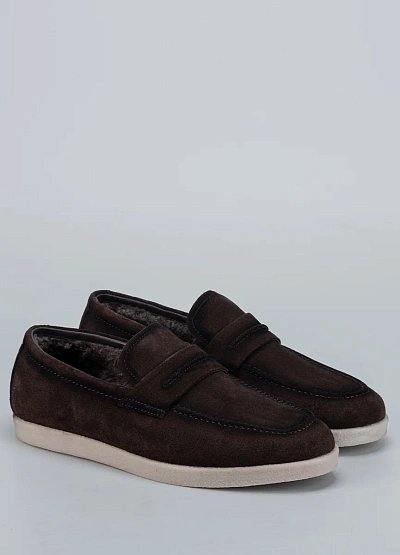 Мужские лоферы Duca Daretti в замшевом исполнении — воплощение уюта и стиля. Модель выполнена из мягкой натуральной замши тёплого коричневого оттенка и дополнена подкладкой из меха, что делает её идеальной для прохладного сезона. Светлая подошва придаёт обуви лёгкость и современный вид.