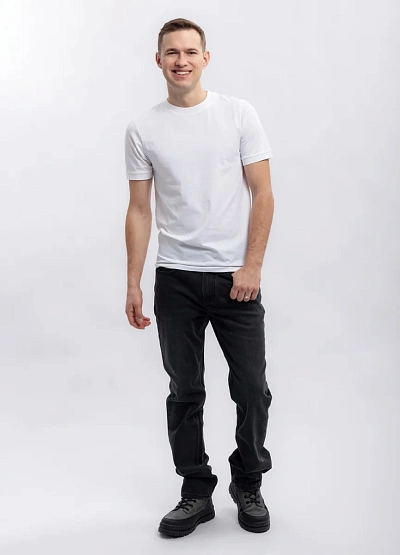 Мужская футболка прямого кроя, выполненная в классическом белом цвете. Изделие имеет короткие рукава и круглый вырез, модель отличается минималистичным дизайном без видимых декоративных элементов.