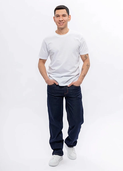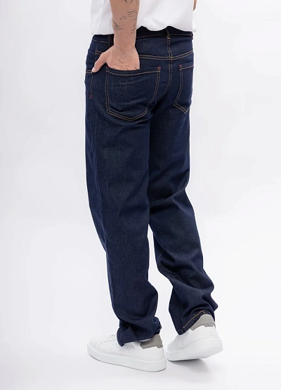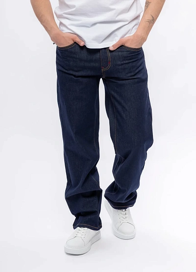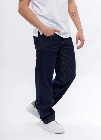 Мужские джинсы классического кроя выполнены в темно-синем цвете. Модель отличается свободной посадкой и контрастной строчкой по швам, что подчеркивает стильный внешний вид изделия.