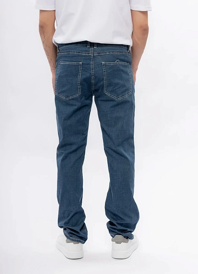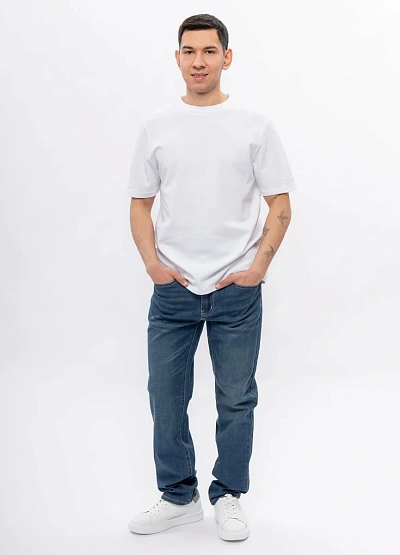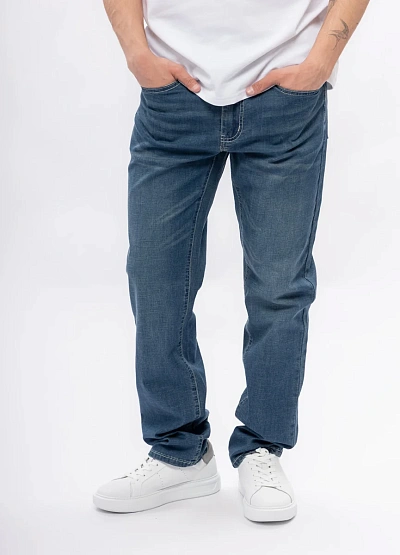 Мужские джинсы прямого кроя синего цвета. Модель выполнена в универсальной голубой гамме с легким эффектом потертостей. Отличается классическим дизайном и средней посадкой.