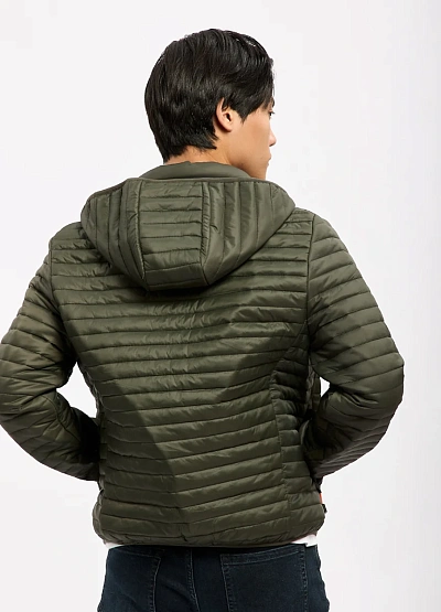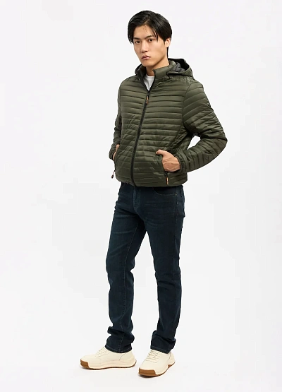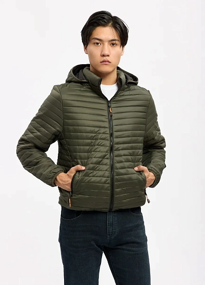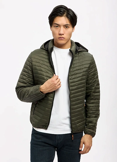 Мужская стёганая куртка в практичном оливковом оттенке — универсальный вариант для прохладной погоды. Лёгкий утеплённый материал хорошо сохраняет тепло, не утяжеляя образ, а горизонтальная простёжка обеспечивает аккуратный и современный внешний вид. Модель дополнена удобным капюшоном, центральной застёжкой на молнию и функциональными карманами. Куртка отлично подходит для повседневной носки в городском ритме и активных прогулок.