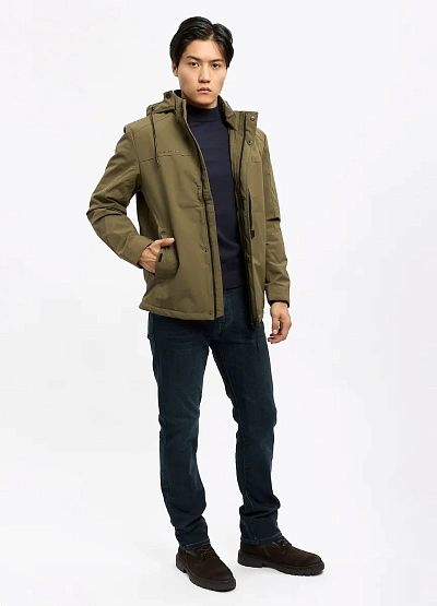 Мужская демисезонная куртка в универсальном оливковом оттенке — функциональная модель для прохладной и ветреной погоды. Прямой крой обеспечивает удобную посадку, не сковывая движений, а плотный материал хорошо защищает от ветра и лёгких осадков. Куртка оснащена капюшоном и несколькими карманами, что делает её практичным выбором для повседневной носки в городском ритме.
