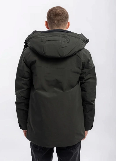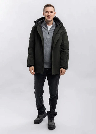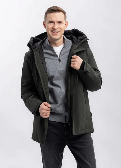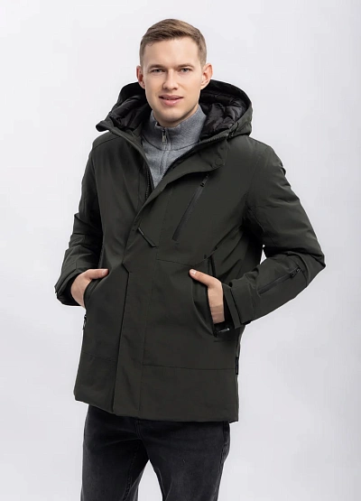 Мужская куртка тёмно-зелёного цвета с прямым кроем и капюшоном. Модель имеет лаконичный дизайн, дополнительные молнии и карманы, что подчёркивает функциональность изделия. Подойдёт для носки в прохладную погоду.