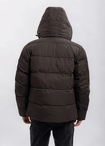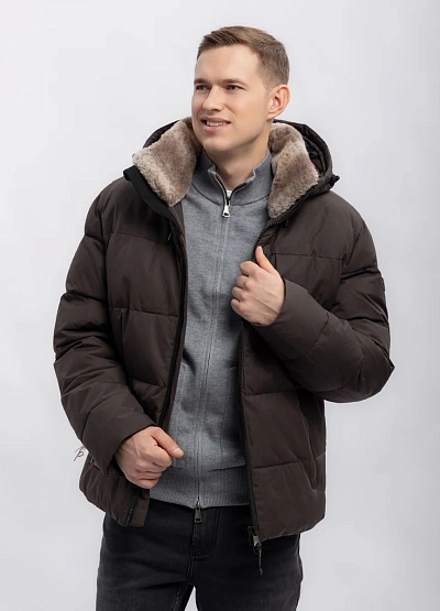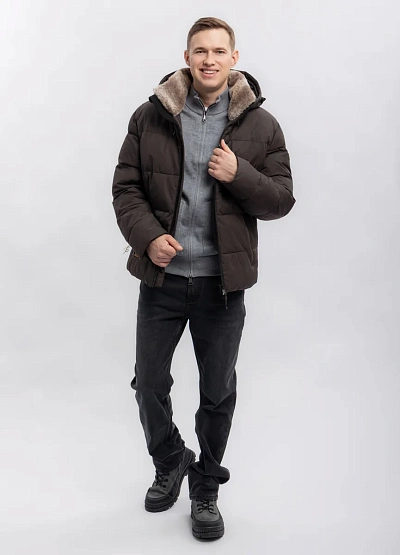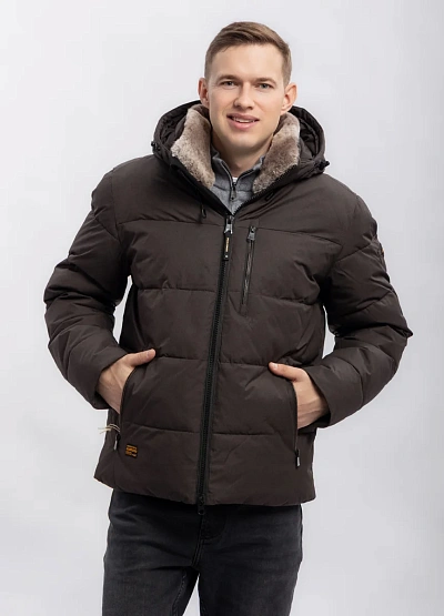 Мужская утеплённая куртка прямого кроя в тёмно-коричневой цветовой гамме. Модель оснащена капюшоном с отделкой из искусственного меха и несколькими карманами на молнии, что придаёт ей практичность и современный внешний вид.