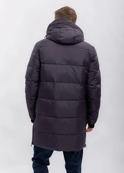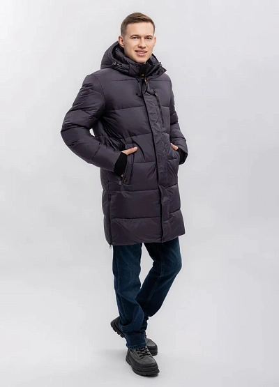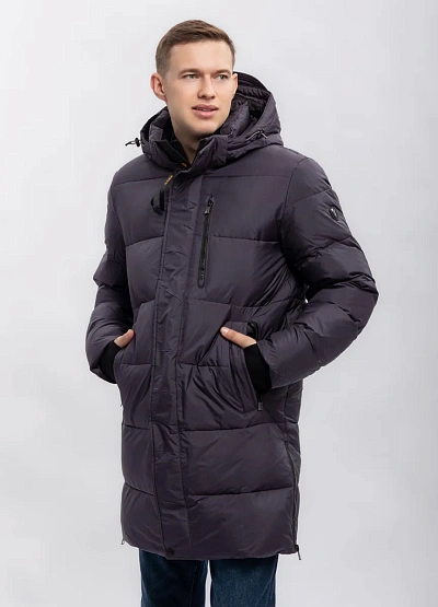 Мужская удлинённая куртка-пуховик тёмно-серого цвета. Модель оснащена капюшоном и застёгивается на молнию, а также имеет несколько внешних карманов на молнии. Стёганая структура и объёмный крой создают современный внешний вид.