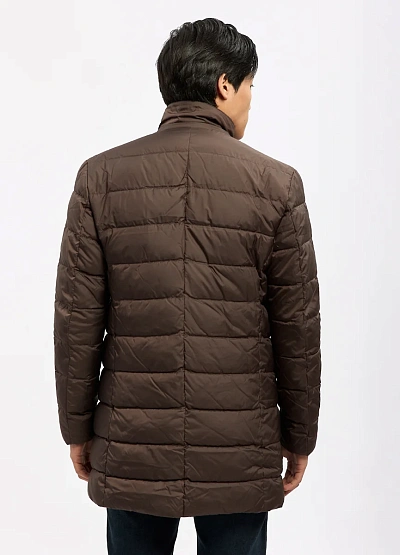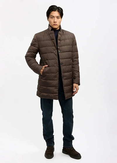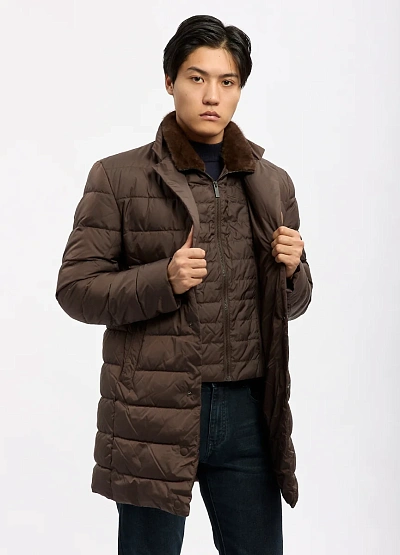 Мужская утеплённая куртка классического силуэта выполнена в сдержанном и элегантном стиле, который отлично подойдёт для городской повседневности и деловых образов. Горизонтальная стёжка равномерно распределяет утеплитель, обеспечивая комфорт и тепло в холодное время года. Особое внимание привлекает аккуратный воротник с отделкой под мех, который добавляет модели статусности и защищает от ветра. Куртка смотрится строго и универсально, легко комбинируется с джинсами и классическими брюками.