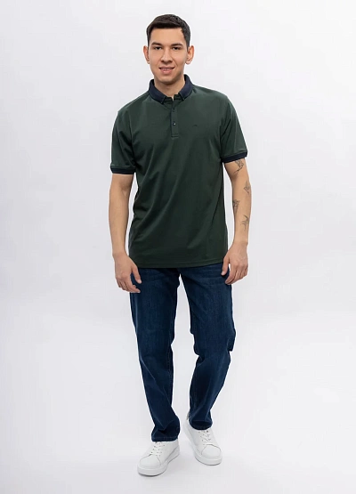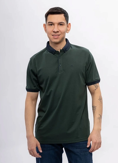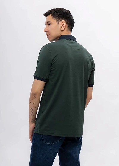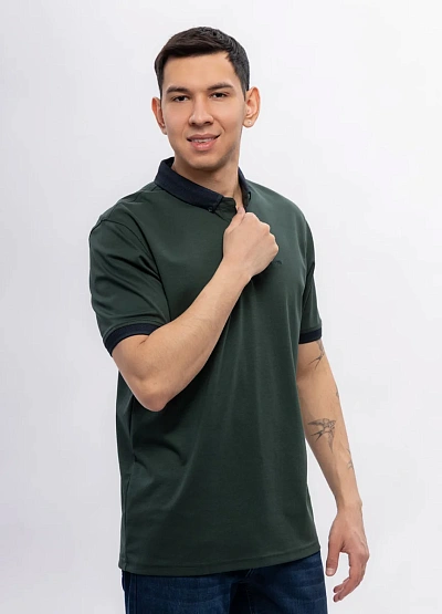 Мужское поло тёмно-зелёного цвета с контрастным тёмным воротником и манжетами. Модель выполнена в классическом стиле, имеет короткие рукава и застёжку на пуговицы.
