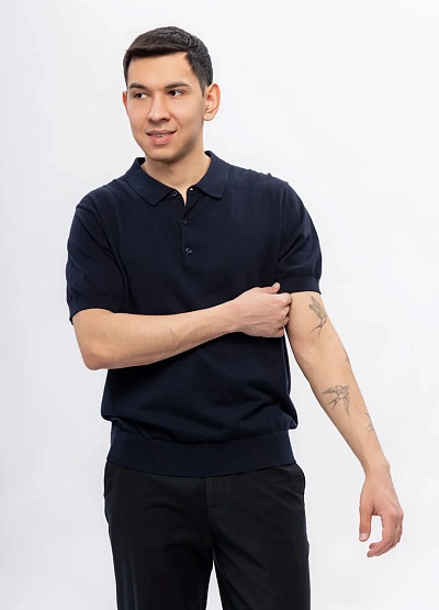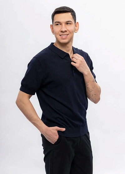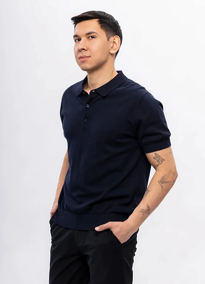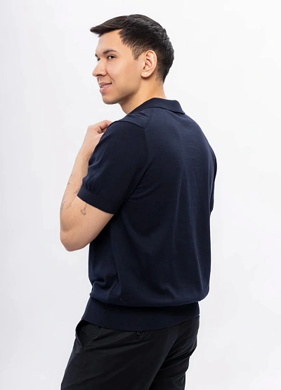 Мужское поло темно-синего цвета с короткими рукавами и классическим воротником. Модель выполнена в лаконичном стиле, с застёжкой на пуговицы спереди и эластичной отделкой по низу изделия и рукава.