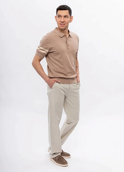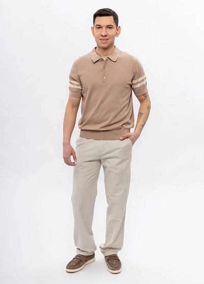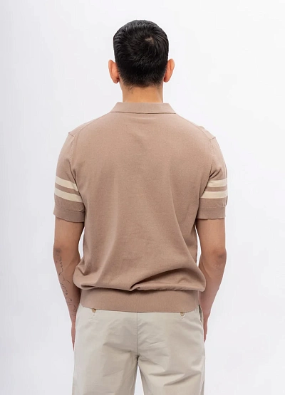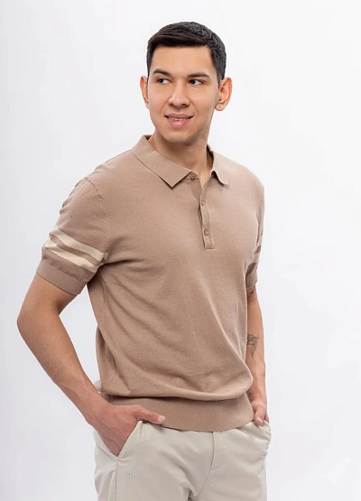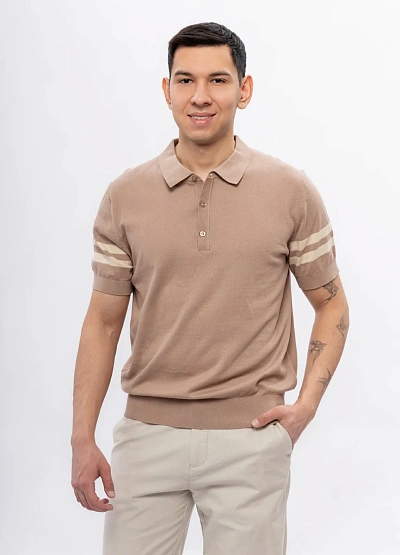 Мужское поло выполнено в спокойной бежевой гамме с короткими рукавами. Модель имеет классический воротник и застёжку на пуговицы, на рукавах присутствуют две светлые полосы, что добавляет изделию визуальный акцент.