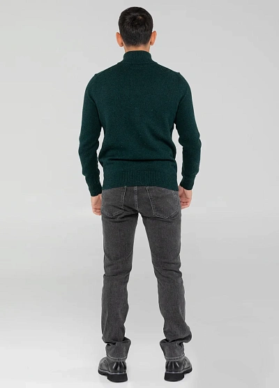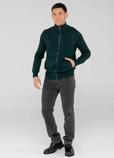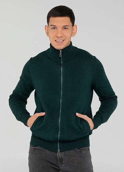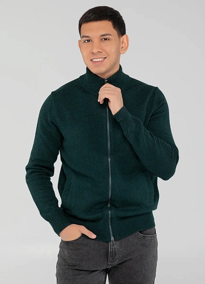 Мужской кардиган на молнии темно-зеленого цвета. Модель с длинными рукавами, высоким воротником и двумя боковыми карманами, выполнена в лаконичном стиле.
