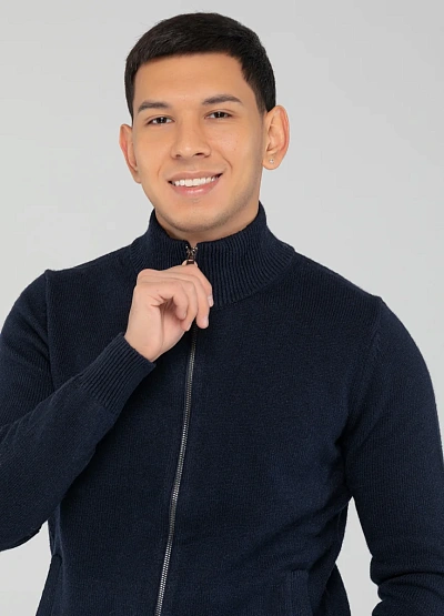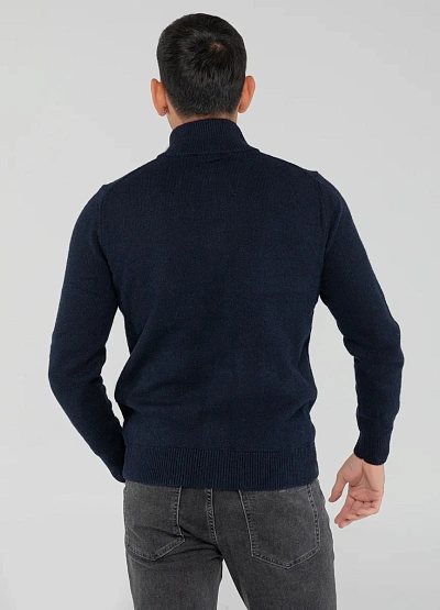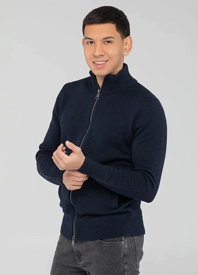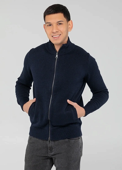 Мужской кардиган тёмно-синего цвета с застёжкой на молнию. Модель выполнена в однотонной цветовой гамме, имеет ворота-стойку и два боковых кармана. Изделие выглядит лаконично и подходит для базового гардероба.