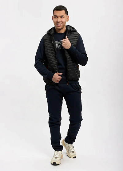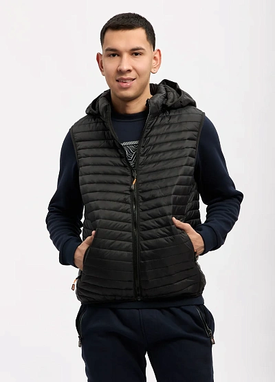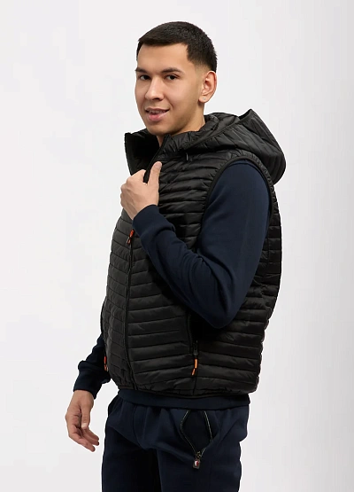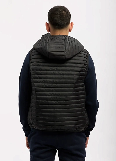 Мужской стёганый жилет с капюшоном — практичный элемент гардероба для активного образа жизни и многослойных повседневных образов. Модель выполнена в универсальном чёрном цвете, имеет лёгкий утеплитель и аккуратную горизонтальную простёжку, обеспечивающую комфорт и тепло в прохладную погоду. Капюшон защищает от ветра, а удобные карманы на молнии делают жилет функциональным и удобным для ежедневного использования. Отлично сочетается со свитшотами, худи и спортивными костюмами.