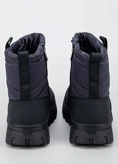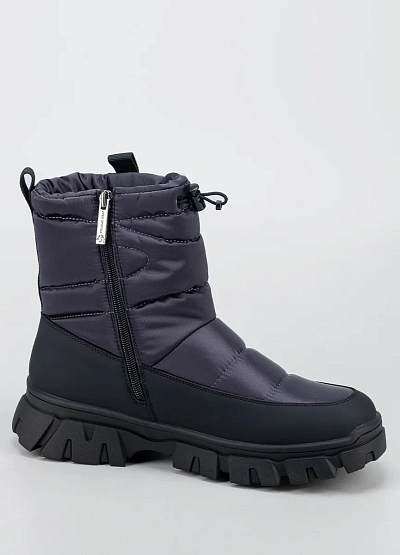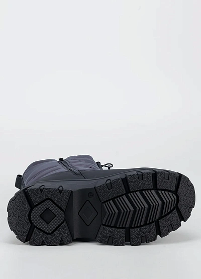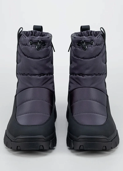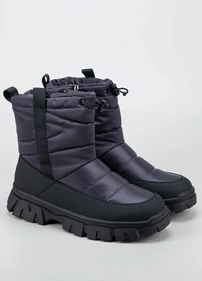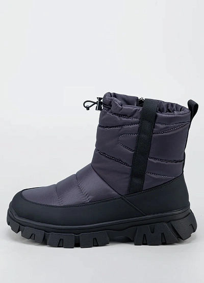 Универсальная модель мужских дутышей в сдержанной темно-серой цветовой гамме. Обувь имеет объемный утеплённый верх со стяжкой и контрастной чёрной подошвой, что придаёт изделию функциональный и современный вид.