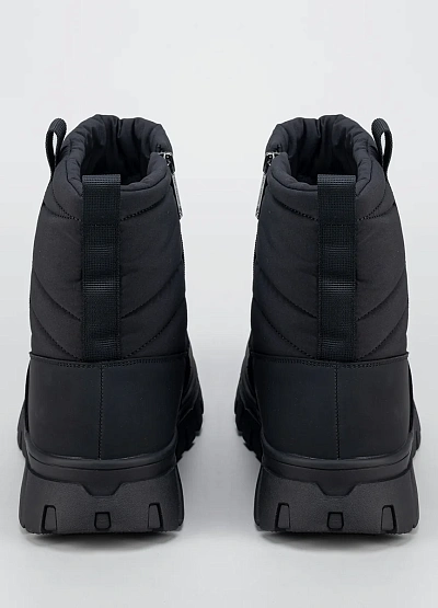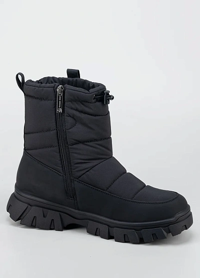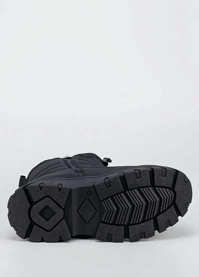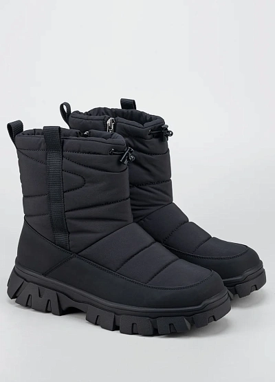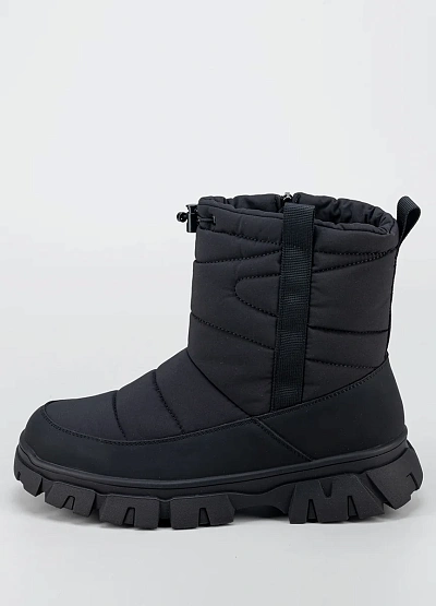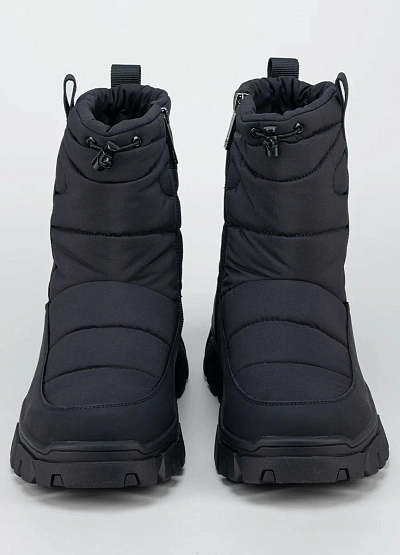 Данная модель унисекс зимних утеплённых дутышей выполнена в чёрной цветовой гамме. Обувь обладает объемной стёганой отделкой, массивной подошвой и утяжкой в верхней части голенища, что обеспечивает комфортную посадку и дополнительную защиту от холода.