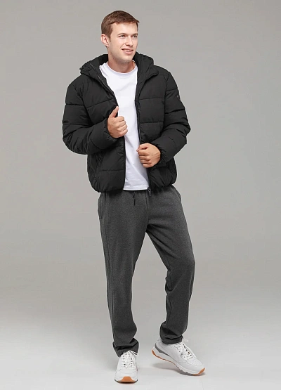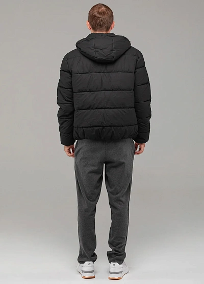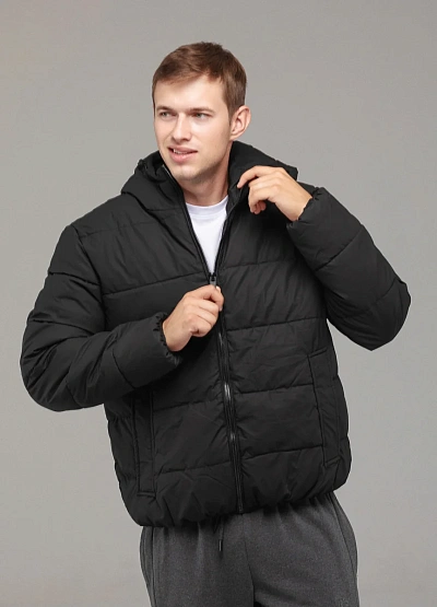 • Тёплая мужская куртка выполнена из прочного материала чёрного цвета и дополнена утеплителем для надёжной защиты от холода.