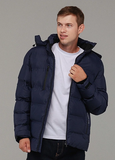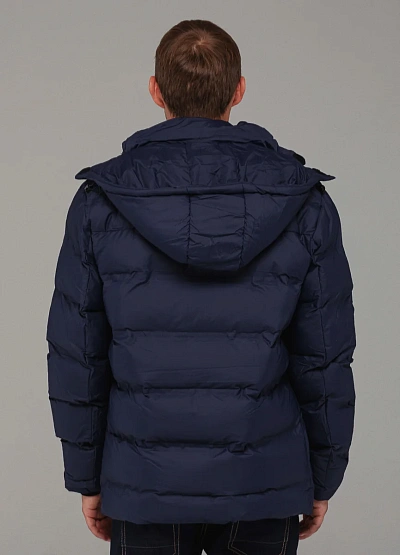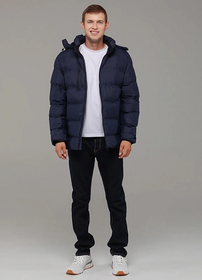 • Утеплённая мужская куртка выполнена из прочного материала тёмно-синего цвета.