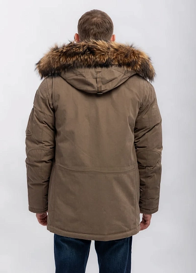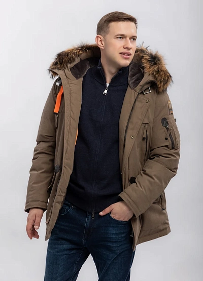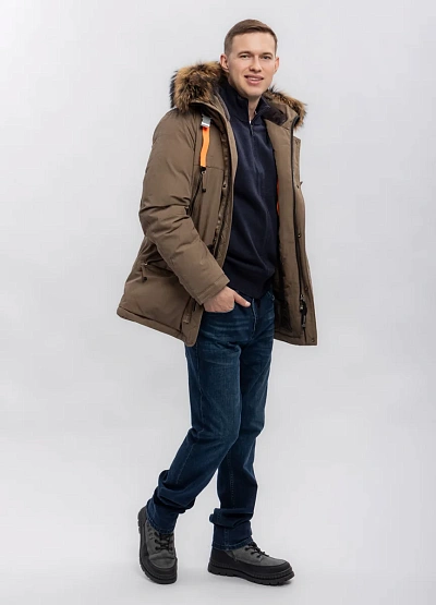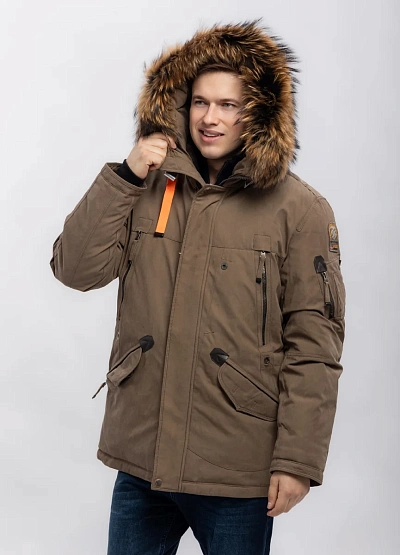 Мужская куртка в коричневой цветовой гамме с отделкой из искусственного меха на капюшоне. Модель имеет множество карманов и выразительный декор в виде оранжевой петли, а также накладные и прорезные детали.