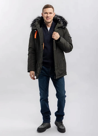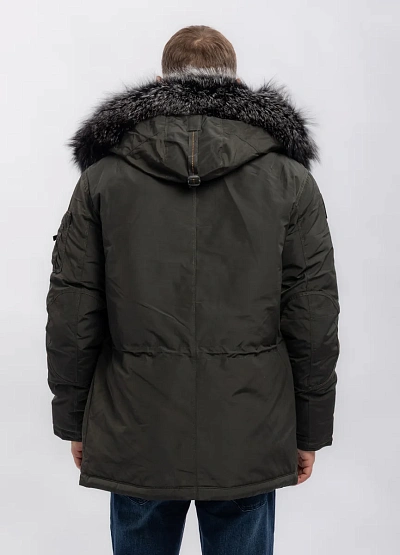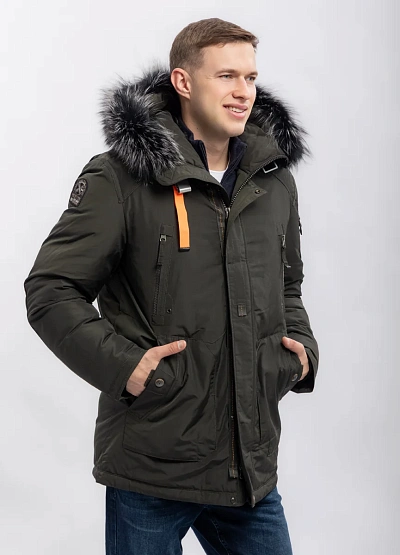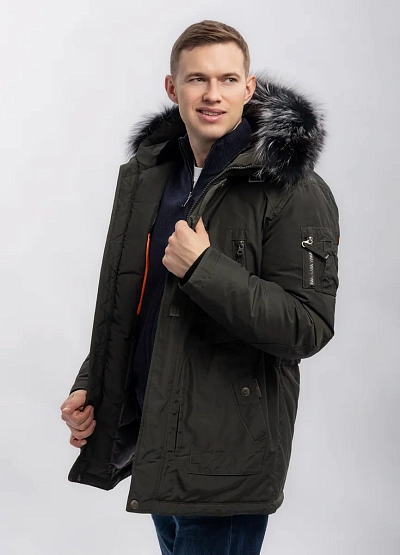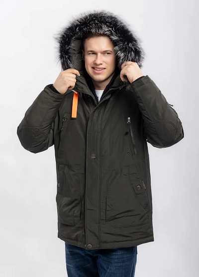 Мужская куртка тёмно-зелёного цвета с капюшоном и отделкой искусственным мехом. Модель отличается прямым кроем, наличием множества карманов и контрастной декоративной лентой на капюшоне.