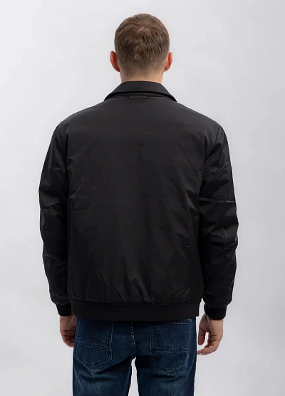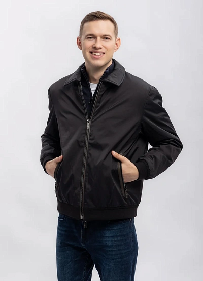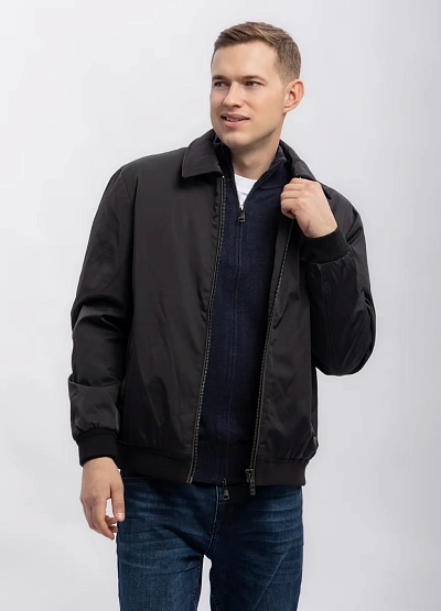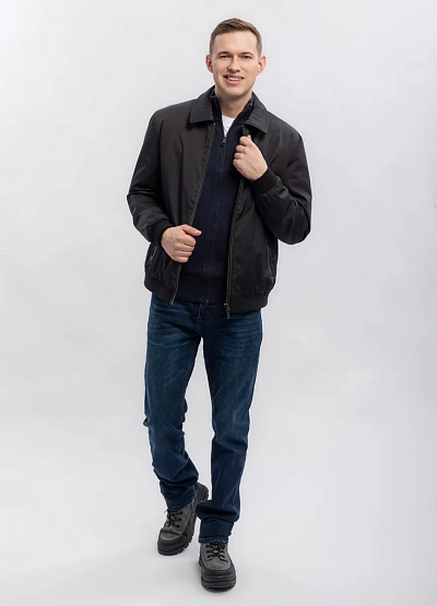 Мужская куртка прямого кроя в тёмной цветовой гамме. Модель выполнена в чёрном цвете, имеет классический отложной воротник и застёгивается на молнию. Видны манжеты и пояс на резинке.