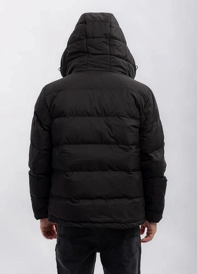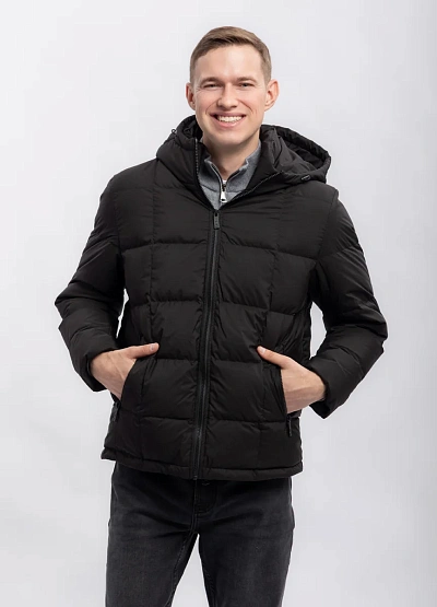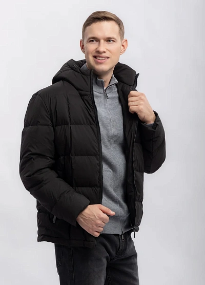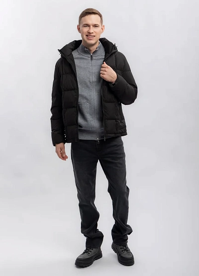 Мужская куртка темного цвета, выполненная в классическом стеганом стиле. Изделие имеет прямой крой, капюшон и застегивается на молнию. Простая и практичная модель для повседневной носки.