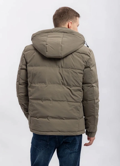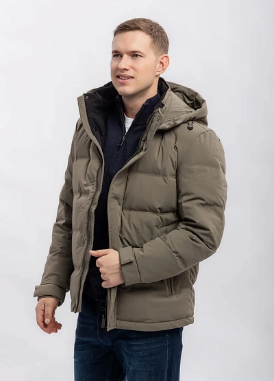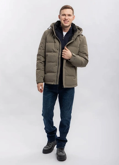 Мужская утеплённая куртка в нейтральной цветовой гамме, выполненная в оттенках хаки. Модель имеет прямой силуэт, объемный съемный капюшон и застёжку на молнию, что делает её подходящей для холодного времени года.