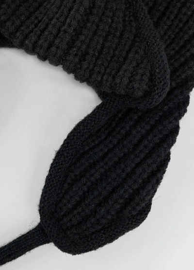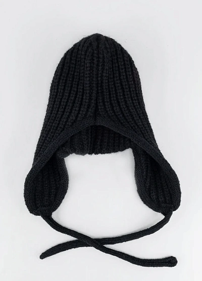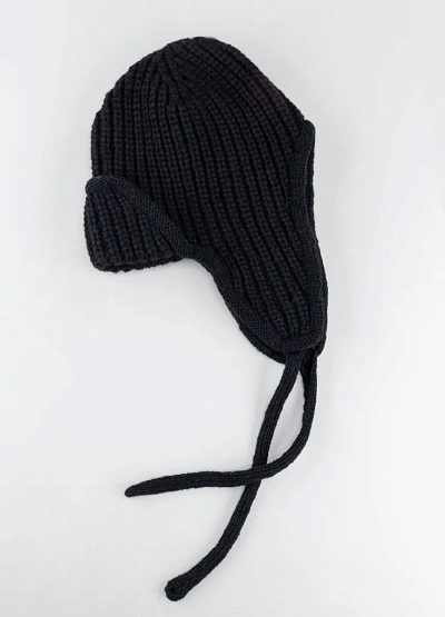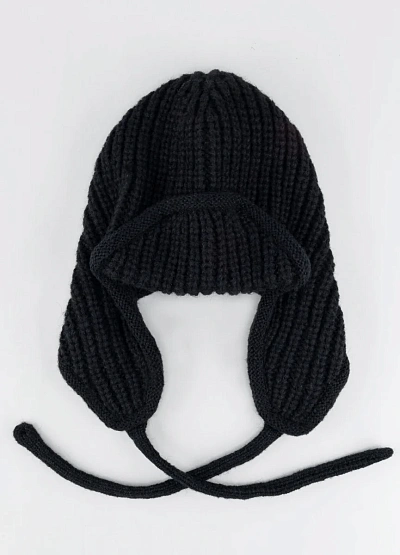 Универсальная вязаная шапка-ушанка в тёмной цветовой гамме. Модель снабжена удлинёнными ушами и завязками, что делает её удобной для холодной погоды и защищает от ветра. Рельефная фактура вязки подчёркивает объём и стиль аксессуара.