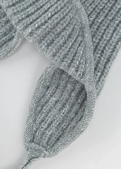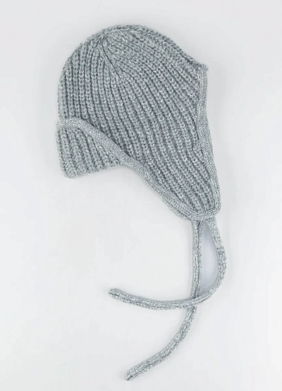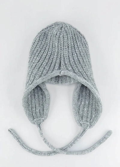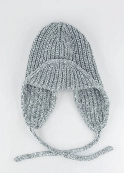 Женская вязаная шапка серого цвета с ушками и завязками. Модель выполнена в светло-серой гамме, имеет объёмную фактурную вязку и широкие боковые части для защиты ушей. Особенность дизайна — удлинённые завязки для фиксации под подбородком.