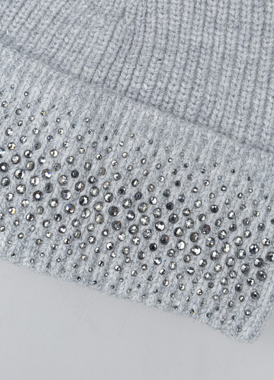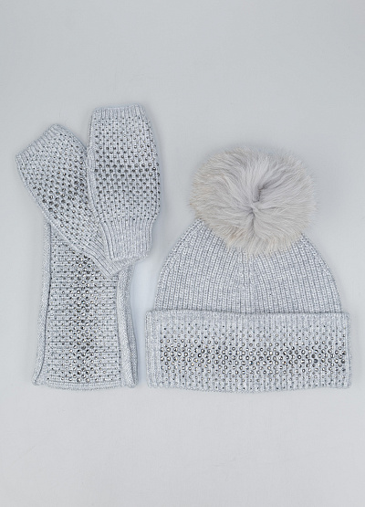 Эффектный зимний комплект из шапки с крупным пушистым помпоном и длинного шарфа — идеальный выбор для тех, кто любит сочетать тепло и стильный блеск. Светло-серая вязаная ткань украшена плотной россыпью страз, которые создают яркий, но при этом элегантный акцент. Шапка хорошо держит форму, мягко прилегает и дарит комфорт в холодную погоду, а шарф обеспечивает надежную защиту от ветра и создает уют при носке.