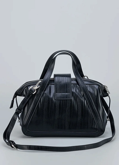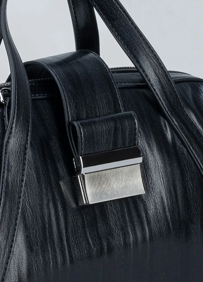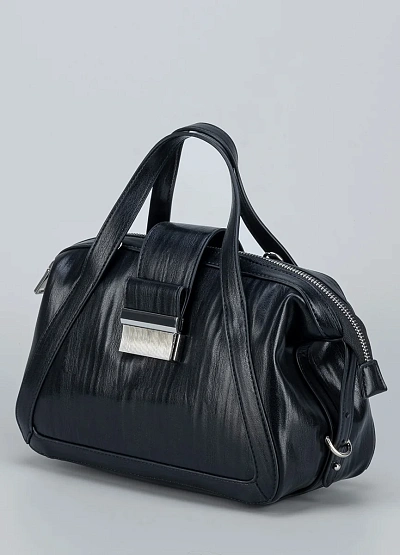 • Сумка из гладкой экокожи с эффектом лакировки и крупной металлической пряжкой на клапане — образец урбанистического шика. Модель чёрного цвета с выраженным блеском будет выигрышно смотреться в вечернем образе и под строгий костюм.