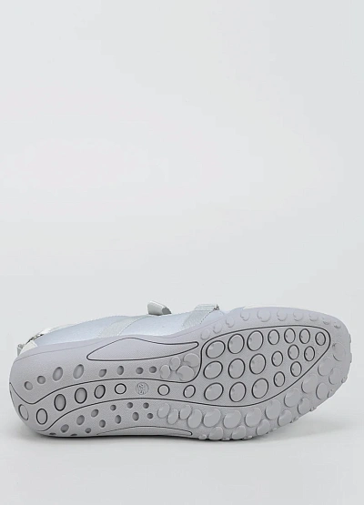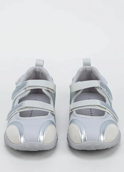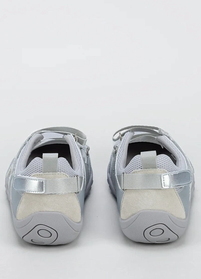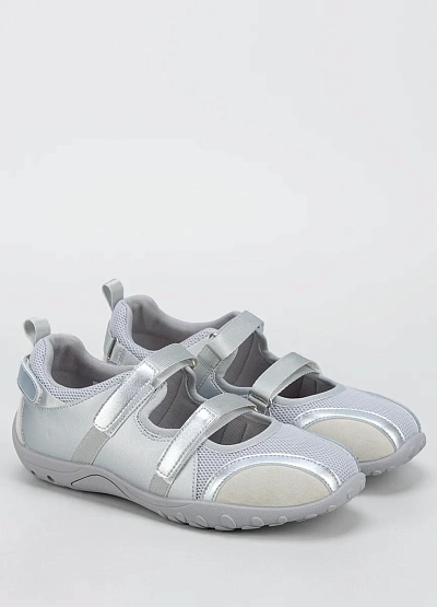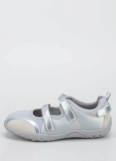 Женские балетки спортивного типа выполнены в светло-серой и серебристой цветовой гамме. Модель отличается закрытым носком, двумя ремешками на липучках и перфорированными вставками, что видно на фото.