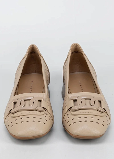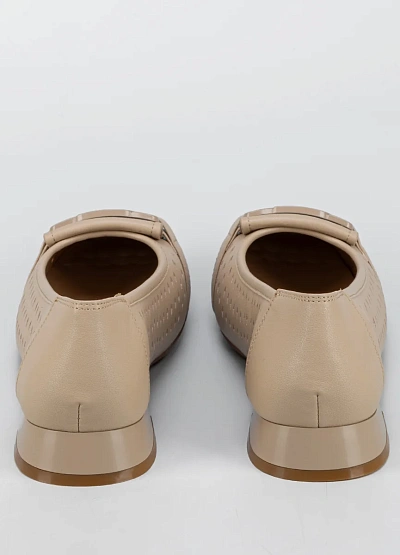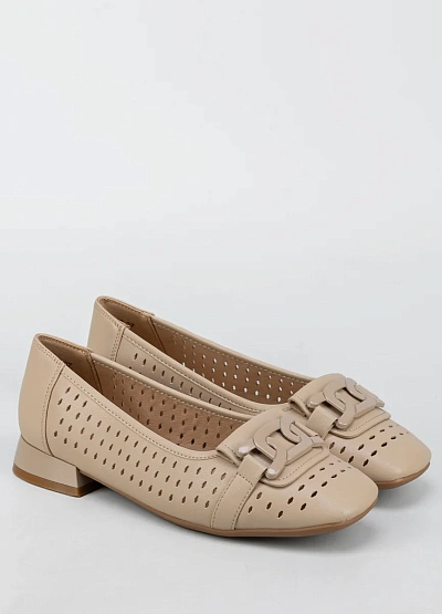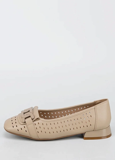 Женские балеткии бежевого цвета выполнены в лаконичном стиле. Модель имеет перфорацию по всей поверхности и украшена декоративной пряжкой на мысе. Подходит для теплого времени года благодаря вентиляционным отверстиям.