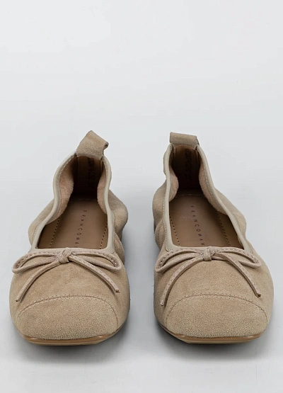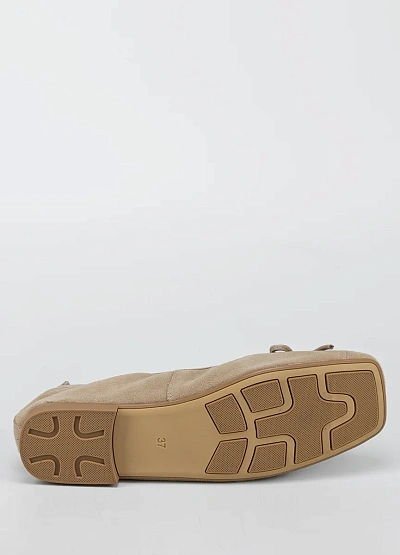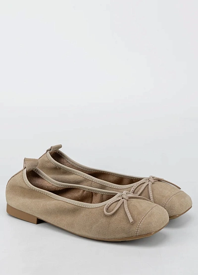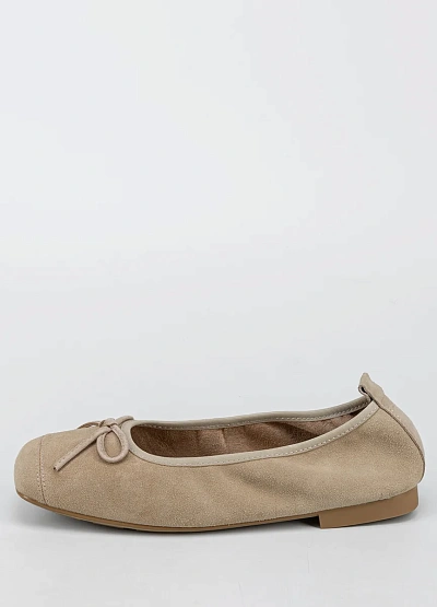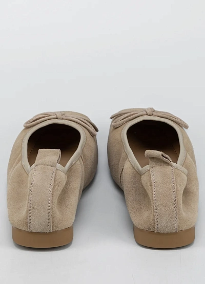 Женские балетки нейтрального бежевого цвета. Модель с округлым носом, небольшим каблуком и декоративным бантиком спереди отличается лаконичным и сдержанным дизайном.
