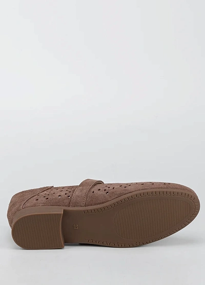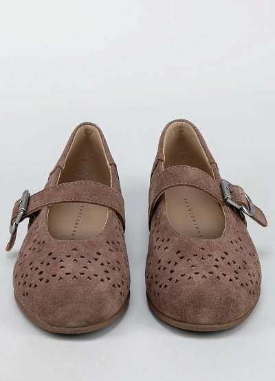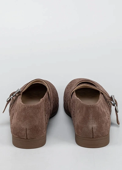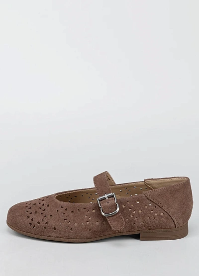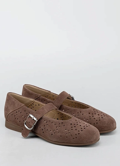 Женские балетки представлены в коричневой гамме. Модель отличается перфорированным верхом с различными по форме отверстиями и ремешком с пряжкой на подъёме стопы.