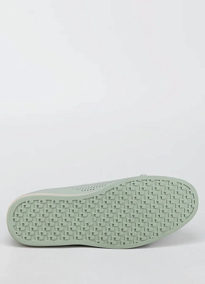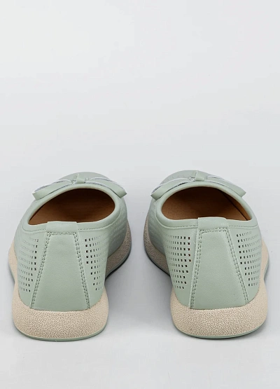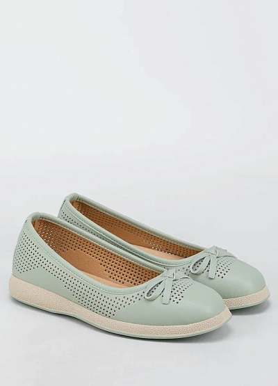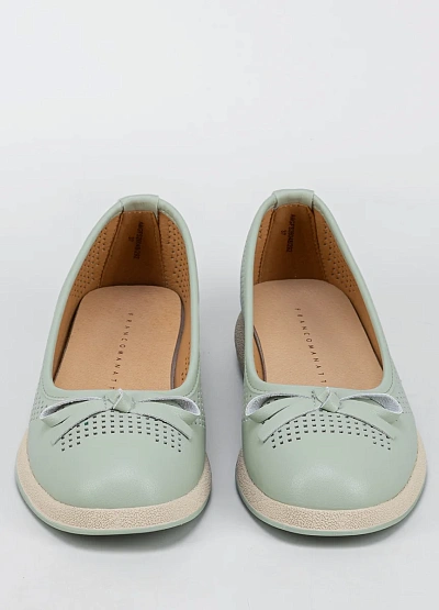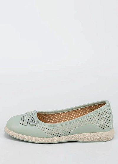 Женские балетки светло-зеленого цвета с контрастной светлой подошвой. Модель выполнена с перфорацией по бокам и на носке, имеет аккуратный декоративный бантик спереди.