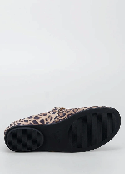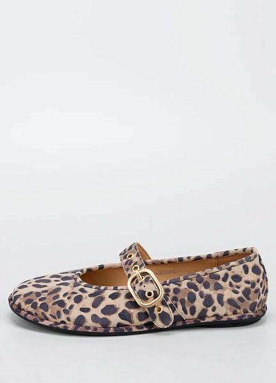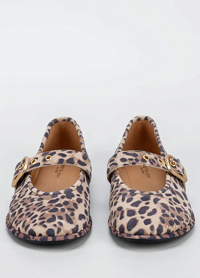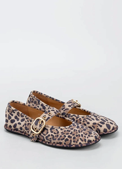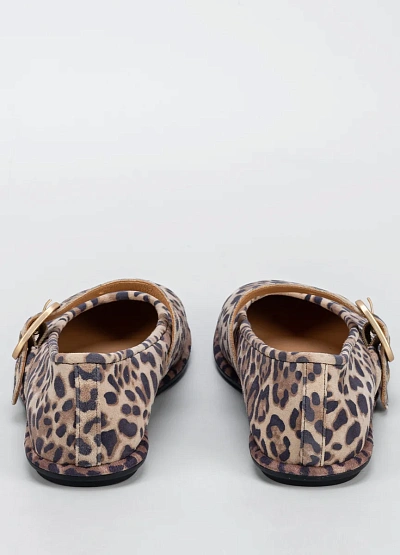 Женские балетки с ремешком выполнены в бежево-коричневой цветовой гамме с леопардовым принтом. Модель имеет округлый носок и украшена декоративной пряжкой на ремешке.