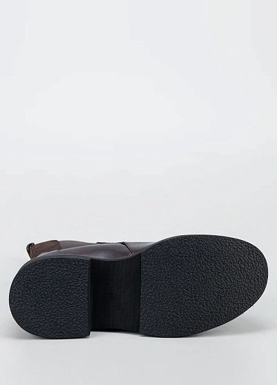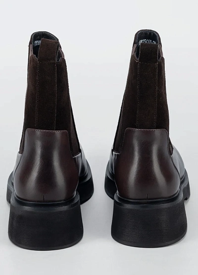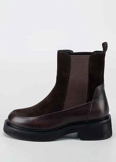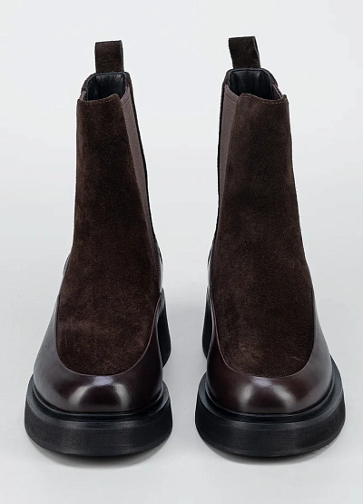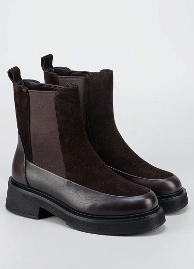 Мужские ботинки-челси выполнены в тёмно-коричневой гамме с плавными переходами оттенков. Модель отличается лаконичным дизайном с гладкой и замшевой текстурами, а также эластичными вставками по бокам для удобства надевания.