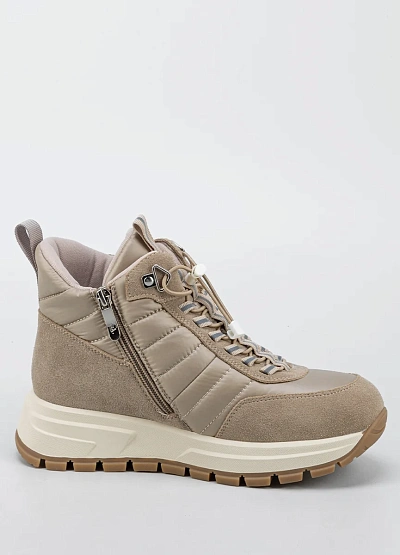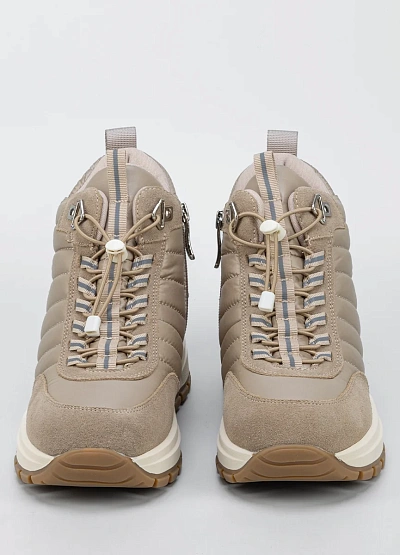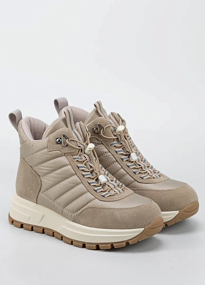 Женские зимние кроссовки в бежево-песочной цветовой гамме выполнены в современном городском стиле с акцентом на комфорт и функциональность. Комбинированный верх из текстиля и искусственной замши обеспечивает тепло, износостойкость и аккуратный внешний вид. Массивная подошва с контрастным протектором гарантирует устойчивость и хорошее сцепление с поверхностью, а утеплённая внутренняя часть делает модель подходящей для холодного сезона. Шнуровка с фиксацией позволяет надёжно зафиксировать стопу и обеспечивает удобную посадку.
