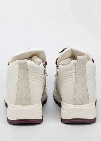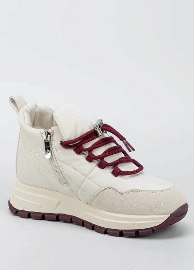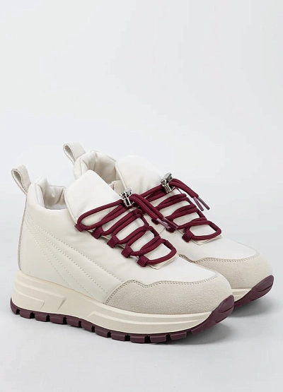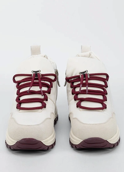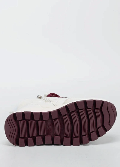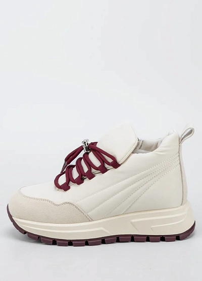 Женские зимние кроссовки выполнены в светлой молочно-бежевой гамме с контрастными бордовыми акцентами, что придаёт модели современный и выразительный характер. Комбинированный верх из плотного текстиля и искусственной замши обеспечивает защиту от холода и аккуратный внешний вид. Утеплённая конструкция и высокая форма надёжно сохраняют тепло, а массивная подошва с глубоким протектором гарантирует устойчивость и комфорт при ходьбе. Шнуровка с фиксатором позволяет быстро и удобно регулировать посадку.