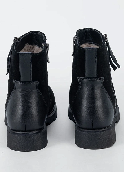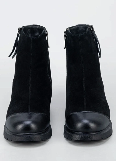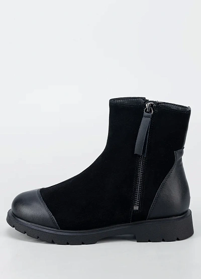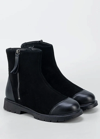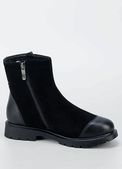Женские ботинки в сдержанном классическом стиле — практичная модель для повседневного гардероба. Комбинированный верх из мягкой замши и гладкой вставки в носочной части создаёт аккуратный внешний вид и повышает износостойкость. Боковая молния обеспечивает удобство при надевании, а устойчивая подошва с протектором подходит для активного городского ритма в демисезонный период.