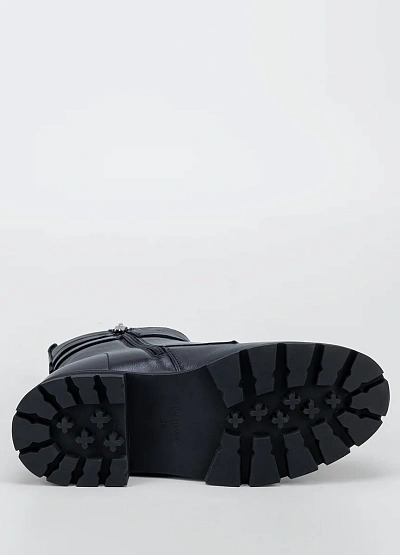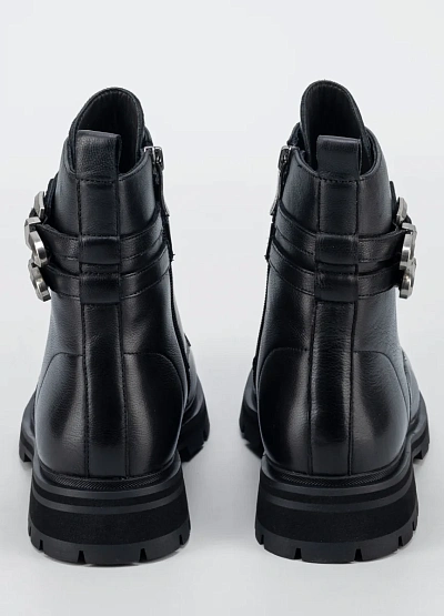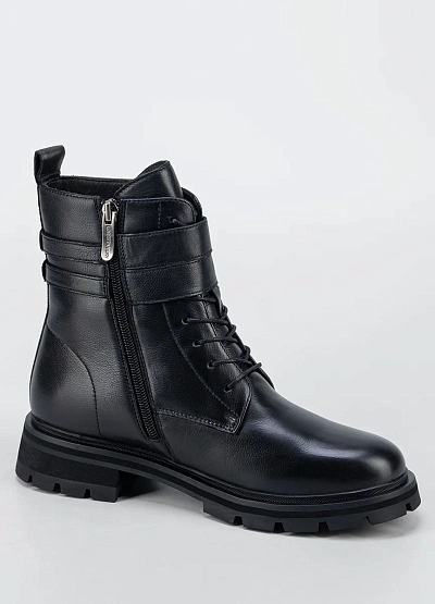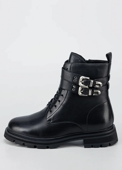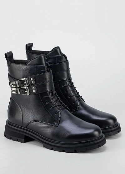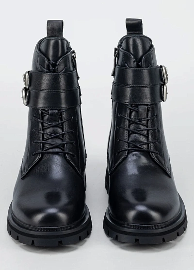 Ботинки для женщин выполнены в классической черной цветовой гамме. Модель отличается застежкой на шнуровке и декоративными двойными ремнями с металлическими пряжками в верхней части. Масивная подошва и высокое голенище придают обуви современный вид.