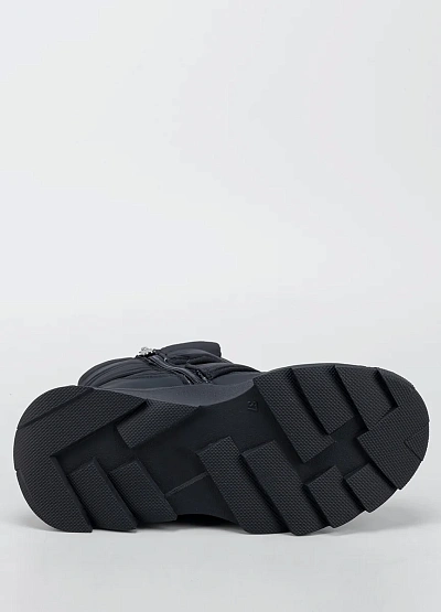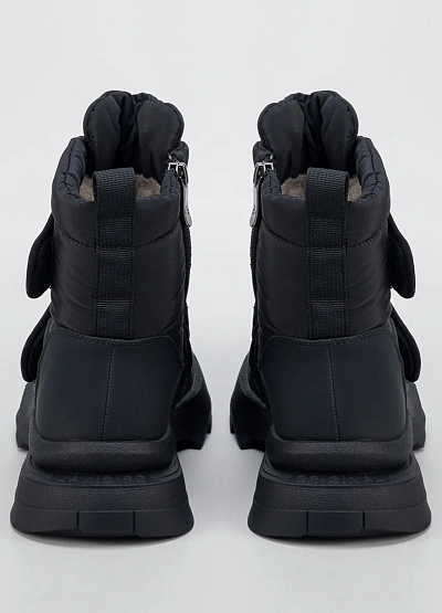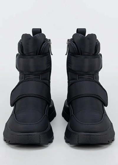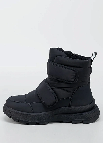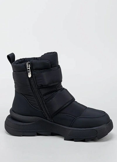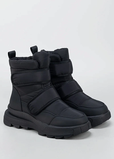 Женские зимние дутики в лаконичном чёрном цвете — удобная и практичная модель для холодного сезона. Верх выполнен из плотного влагостойкого текстиля с мягкой стёганой фактурой, которая эффективно защищает от ветра и холода. Фиксация осуществляется с помощью широкого клапана на липучке, обеспечивая комфортную посадку и простоту надевания. Утолщённая подошва с рельефным протектором гарантирует устойчивость на скользких поверхностях и комфорт при длительной ходьбе.