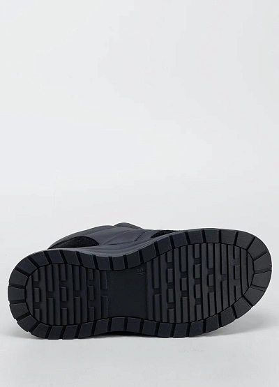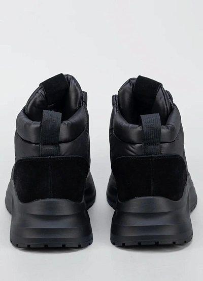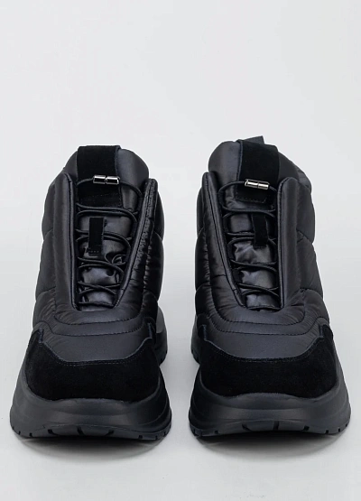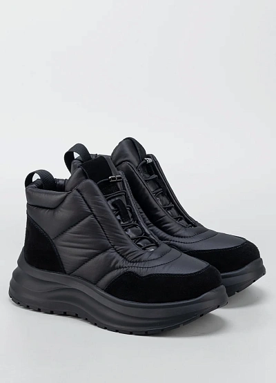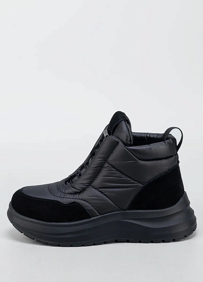 Женские зимние кроссовки выполнены в лаконичном чёрном цвете и сочетают в себе практичность и современный городской стиль. Комбинированный верх из плотного текстиля и замшевых вставок обеспечивает защиту от холода и влаги, а мягкая утеплённая подкладка создаёт комфорт при носке в холодное время года. Объёмная анатомическая подошва с выраженным протектором гарантирует устойчивость и амортизацию при ходьбе, снижая нагрузку на стопу. Высокий силуэт надёжно фиксирует голеностоп, делая модель удобной для активного повседневного использования.